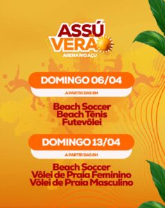 O esporte vai tomar conta de Assú nos próximos dias! Começa neste domingo (6) o Assú Verão 2025 que promete movimentar a cidade com muita competição e energia na Arena Rio Assú. O evento também acontecerá no domingo do dia 13 e reunirá atletas e torcedores para disputas eletrizantes de beach soccer, beach tênis, futevôlei e vôlei de praia, reforçando o compromisso do município com o incentivo ao esporte e lazer.