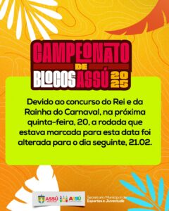 A Prefeitura Municipal do Assú, através da Secretaria de Esportes e Juventude, informa que as partidas do Campeonato de Blocos de Assú 2025, inicialmente previstas para esta quinta-feira (20/02), serão realizadas na sexta-feira (21/02).