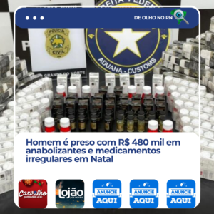 Uma ação conjunta da Receita Federal do Brasil e da Polícia Civil do Rio Grande do Norte resultou na apreensão de esteroides anabolizantes e medicamentos de origem irregular avaliados preliminarmente em aproximadamente R$ 480 mil, na manhã desta segunda-feira 23, em Natal. Um homem de 37 anos foi preso em flagrante.