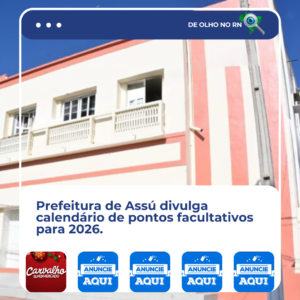 Prefeitura de Assú publicou o calendário oficial de pontos facultativos para 2026. O ano terá 14 datas em que o expediente será opcional para os servidores públicos municipais, distribuídas entre feriados nacionais, estaduais e municipais, além de datas específicas do município.