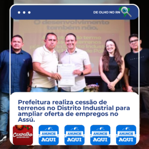 Prefeitura do Assú assinou nesta segunda-feira (29), no Cine Teatro Pedro Amorim, o termo de posse de terrenos públicos no Distrito Industrial Sandoval Martins de Paiva. O ato oficializou a cessão de 18 áreas que serão destinadas à instalação e expansão de atividades produtivas no município.