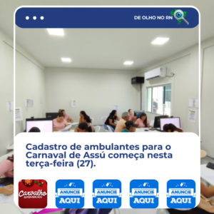 A Prefeitura de Assú inicia nesta terça-feira (27) o cadastro de ambulantes que desejam trabalhar nos polos do Carnaval 2026. As inscrições acontecem na Secretaria Municipal de Serviços Públicos, no Centro Administrativo até o dia 3 de fevereiro.