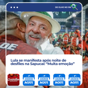 O presidente Luiz Inácio Lula da Silva (PT) se manifestou após acompanhar a primeira noite dos desfiles do Grupo Especial do Carnaval do Rio de Janeiro, na noite desse domingo (15/2), na Marquês de Sapucaí. O chefe do Planalto foi homenageado pela Acadêmicos de Niterói, com o samba-enredo “Do Alto do Mulungu Surge a Esperança: Lula, o Operário do Brasil”.